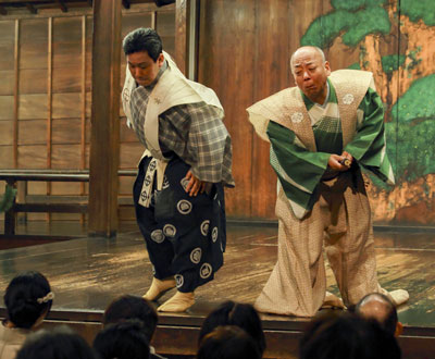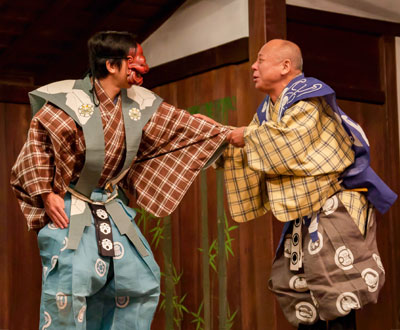 | 2015年二人山伏ふたりやまぶし 登場人物…山伏甲、山伏乙、茶屋山伏が田舎の茶屋で休息していると、偶然そこにもう一人山伏がやってくる。 最初はお互い仲良く話しているが、些細なことから喧嘩になりどちらの法力が強いかを競うことになる。 二人は茶屋の亭主を祈り伏せようとするもそんなものが効くはずもなく…。 |  |