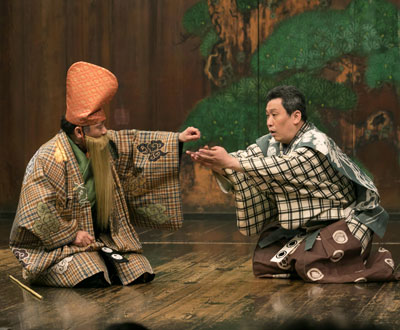 | 2023年三竦みさんすくみ 登場人物…大名、鬼、山伏狂言には時々偉そうな威張ったキャラクターというのが登場します。風刺的な狂言の性質上、ほとんどの場合そういった人物は最後に懲らしめられるというオチで終わります。しかし、世の中いつもそんなに都合よく行くものではありません。時には出てくる人出てくる人みーんな横柄で偉そうだということも…。 |  |